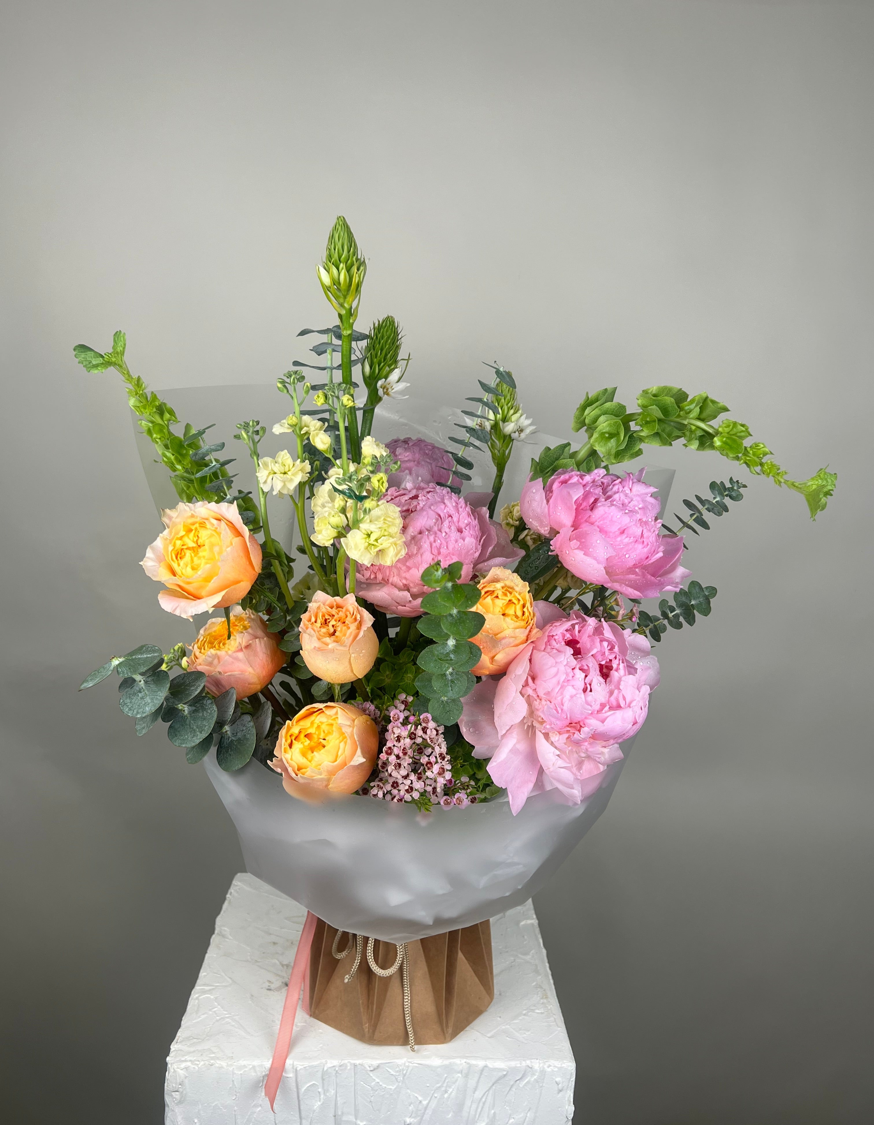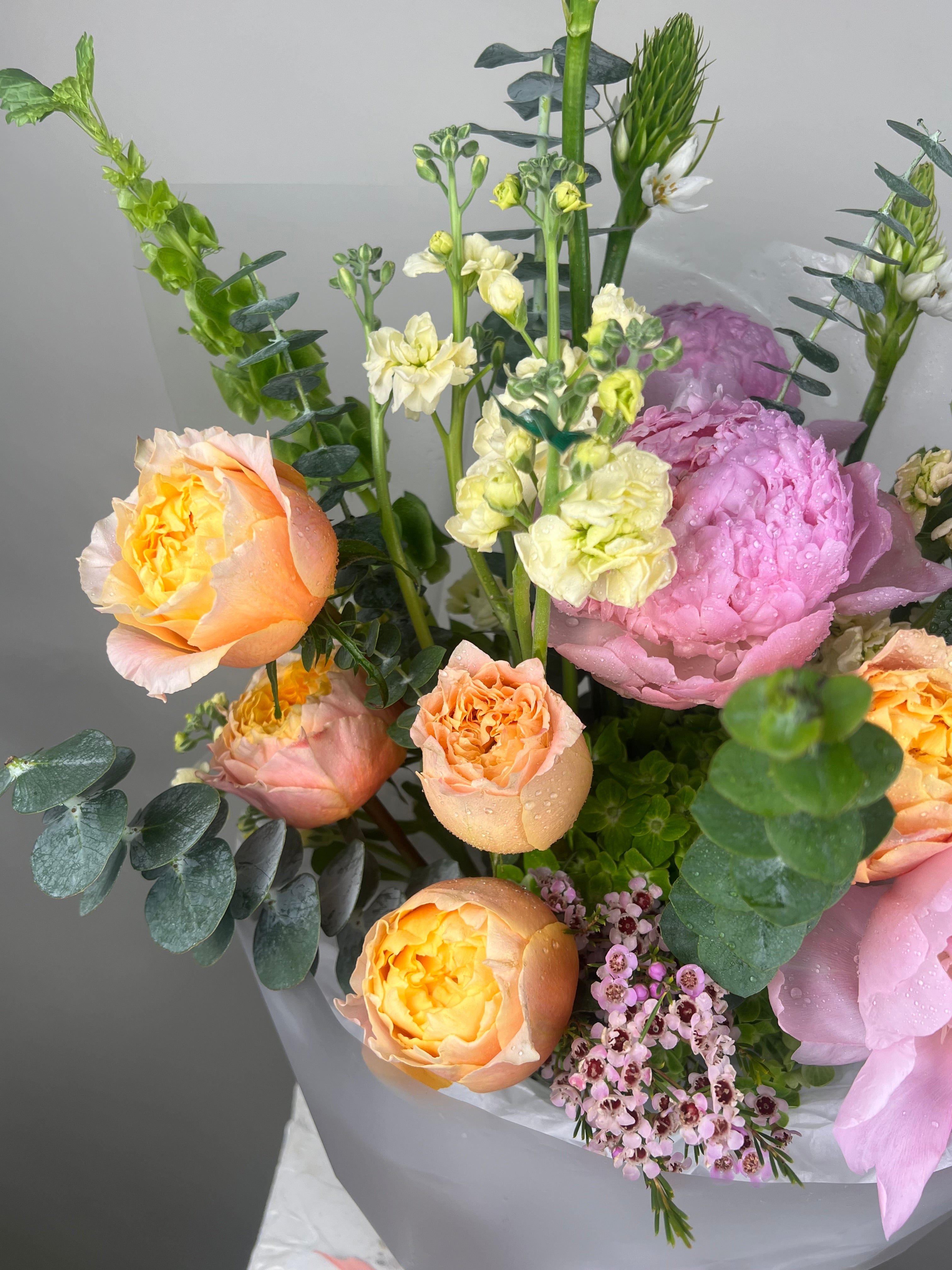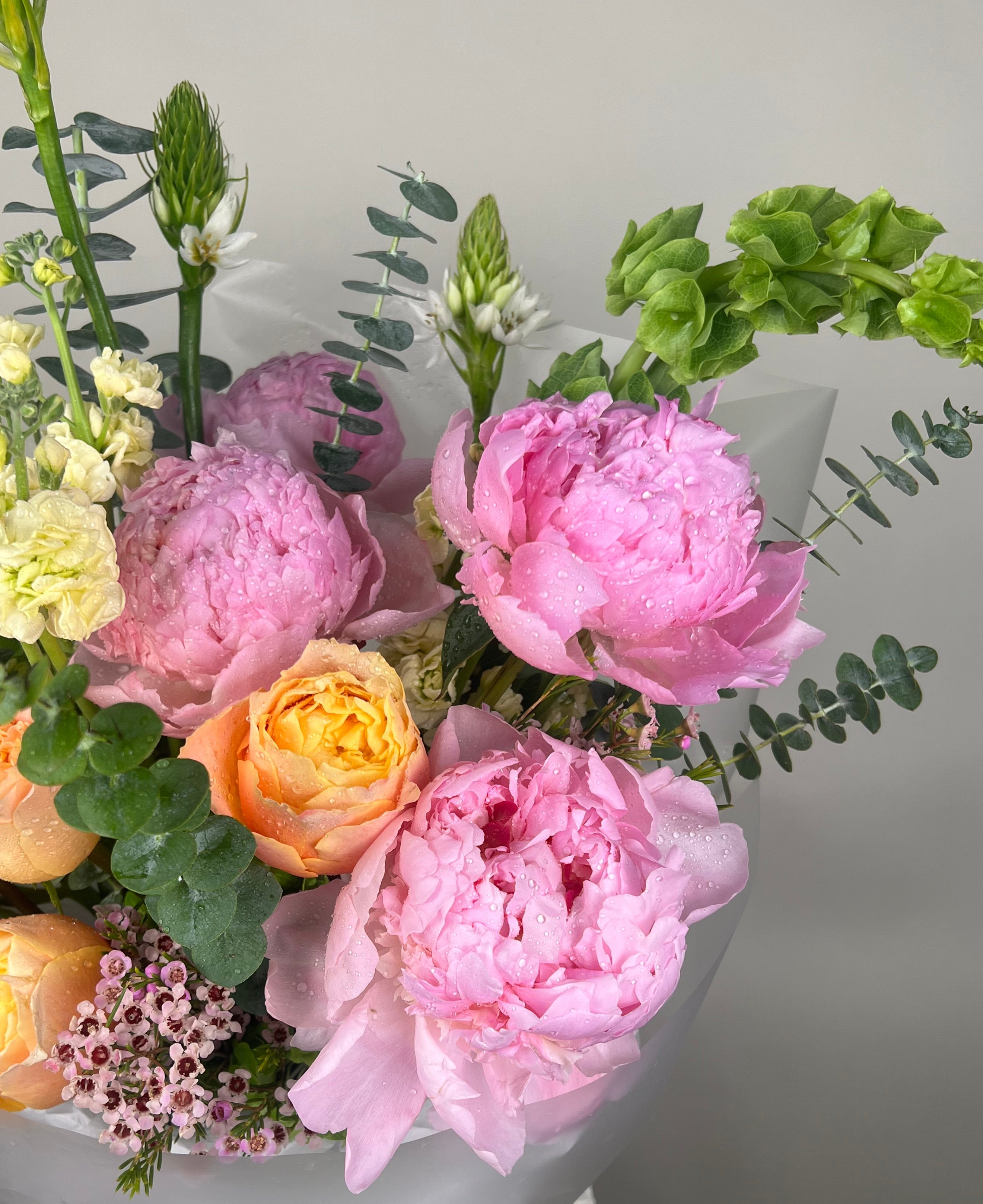 A gorgeous bouquet of premium Dutch peonies, garden roses, hydrengeas, stars of Bethlehem, Irish bells, stock flowers.