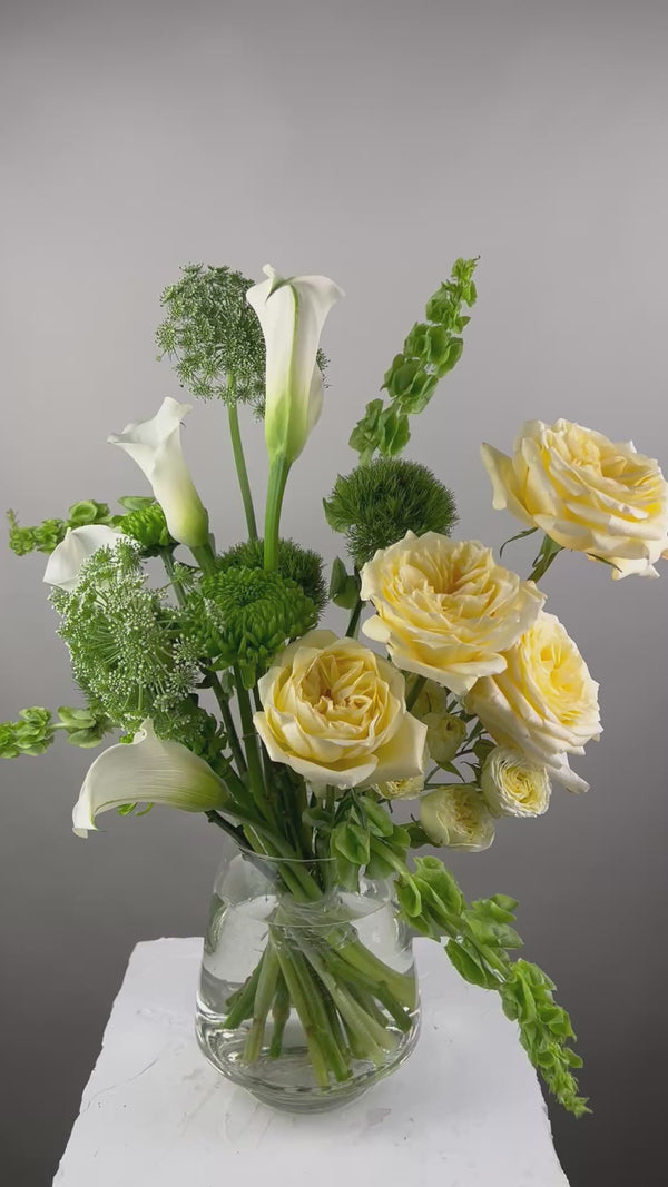 Due to seasonal availability, some flowers may be substituted with flowers of equal or higher value while maintaining the color palette and overall mood of the arrangement.