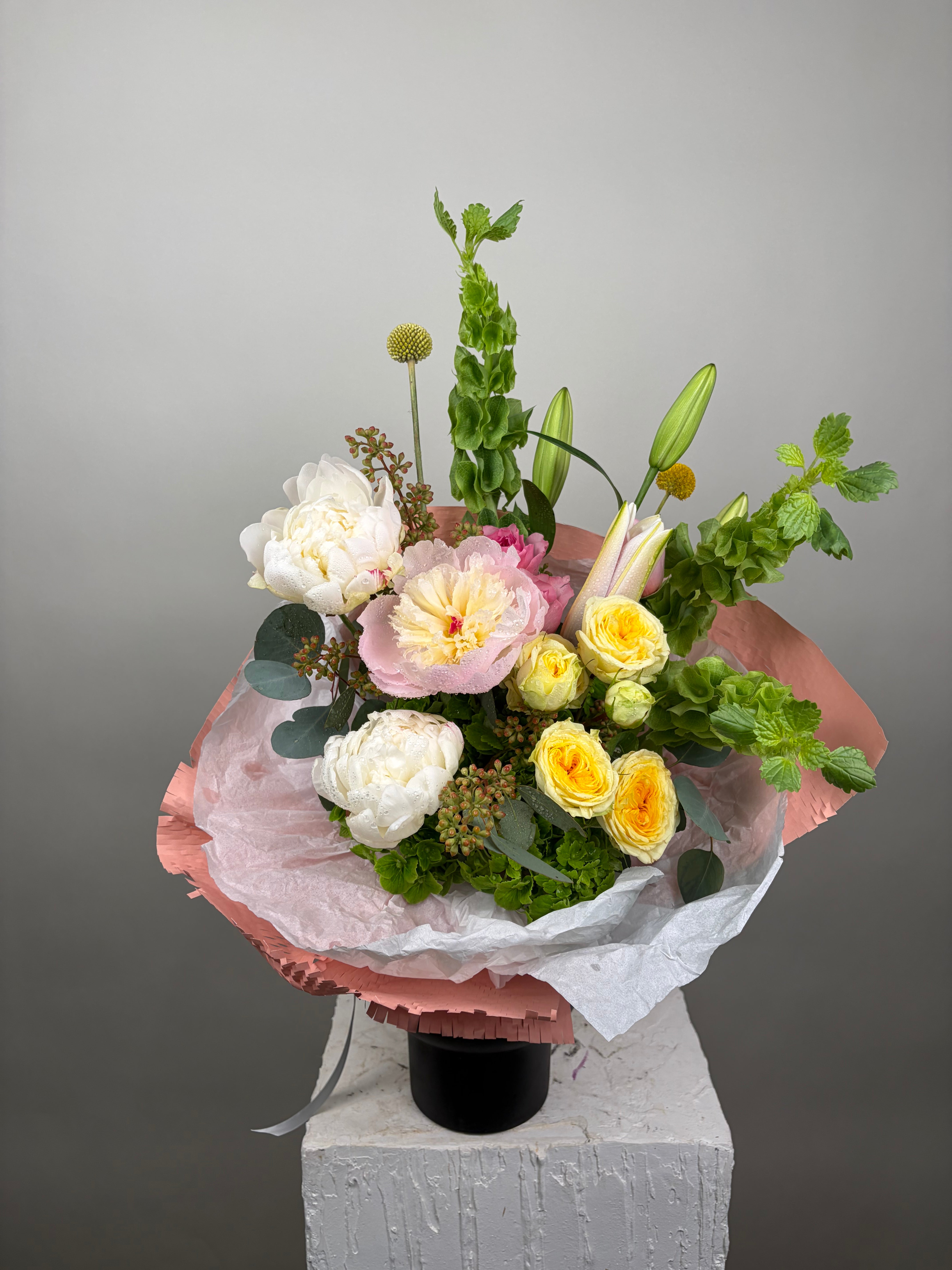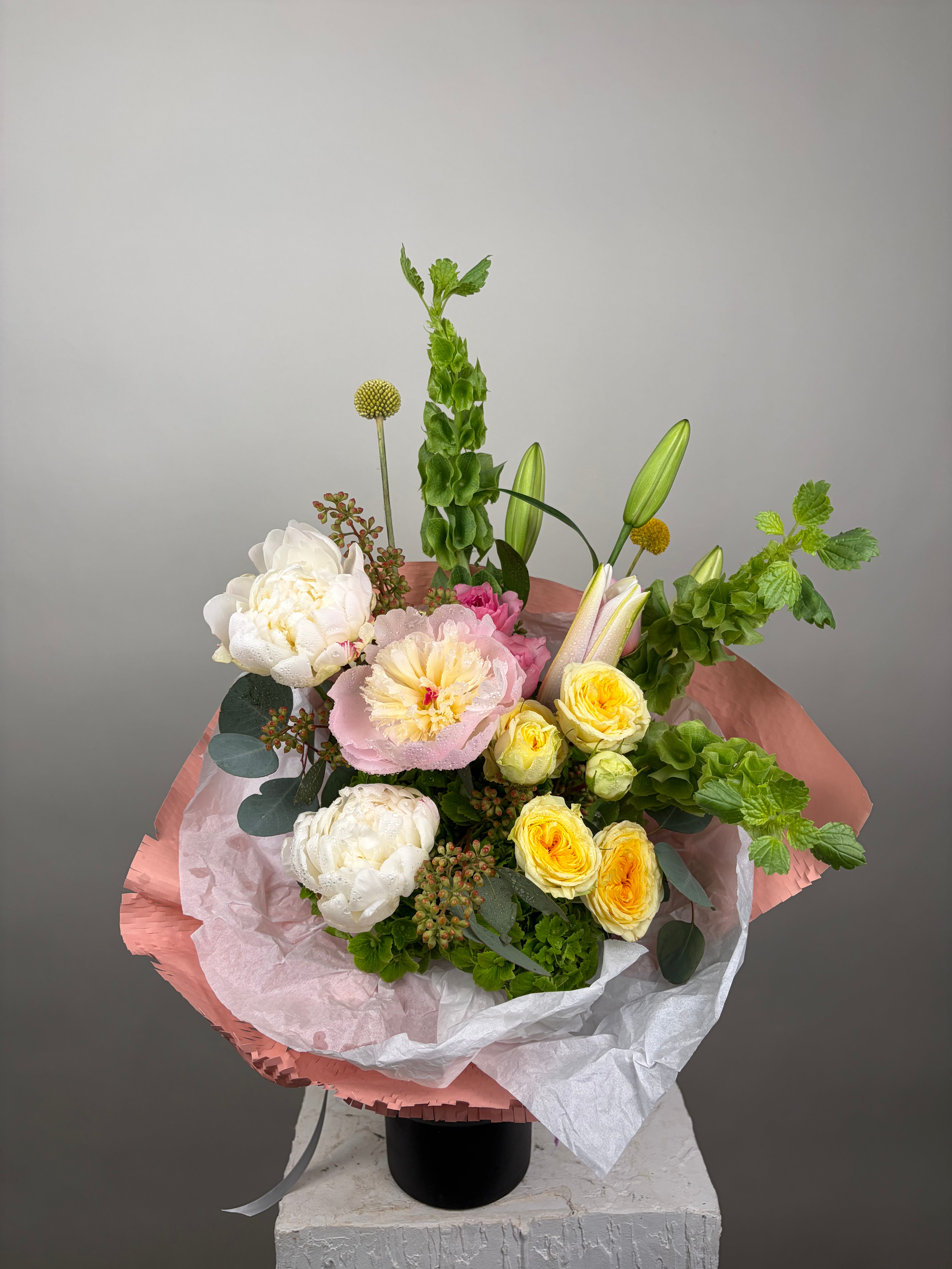 A bouquet of gorgeous peonies, yellow spray garden roses, lilies, green hydrengeas, Irish bells, pink garden roses, mix of greenery.