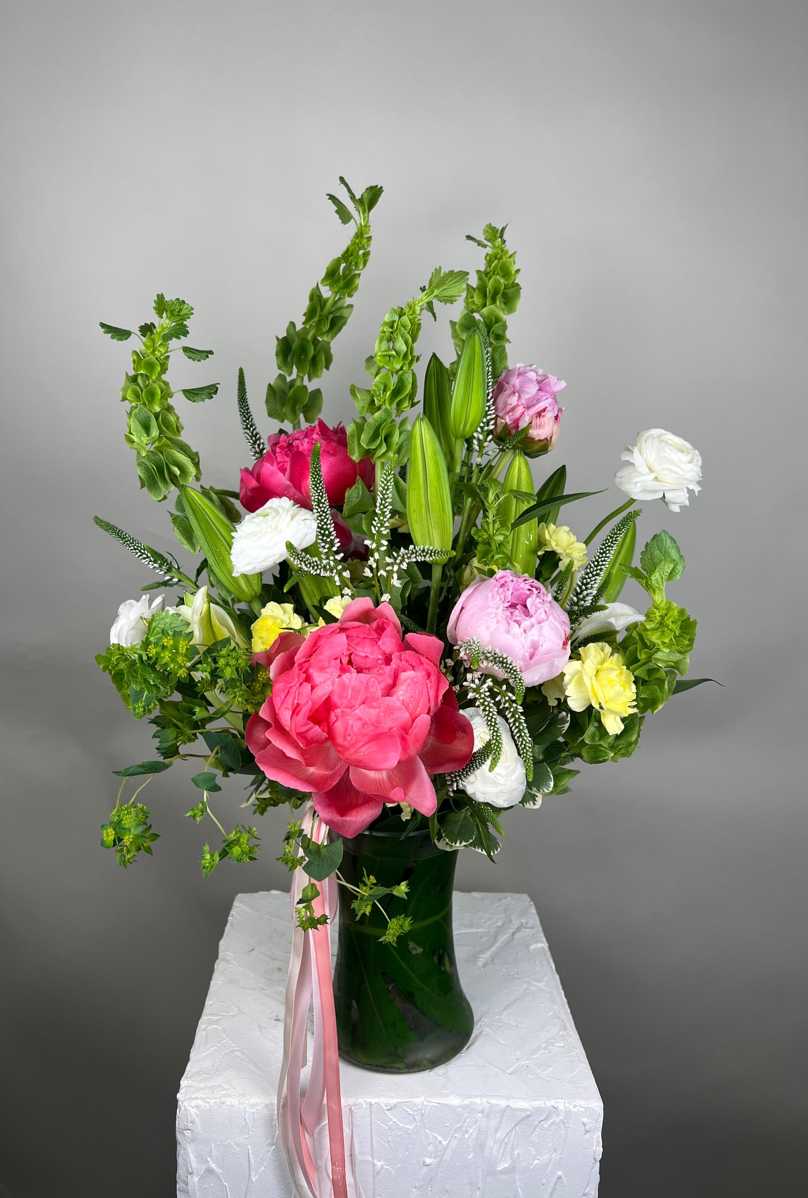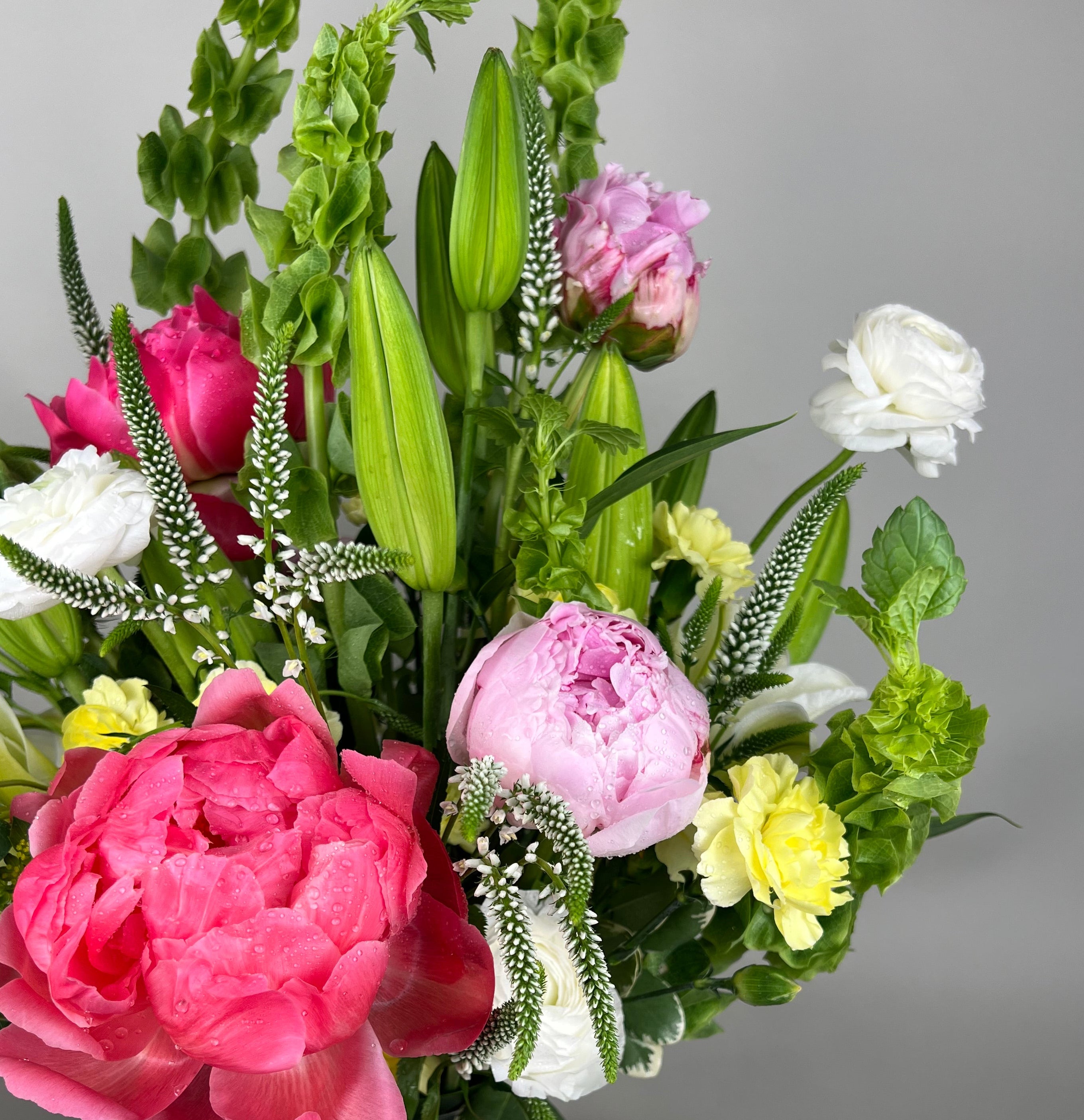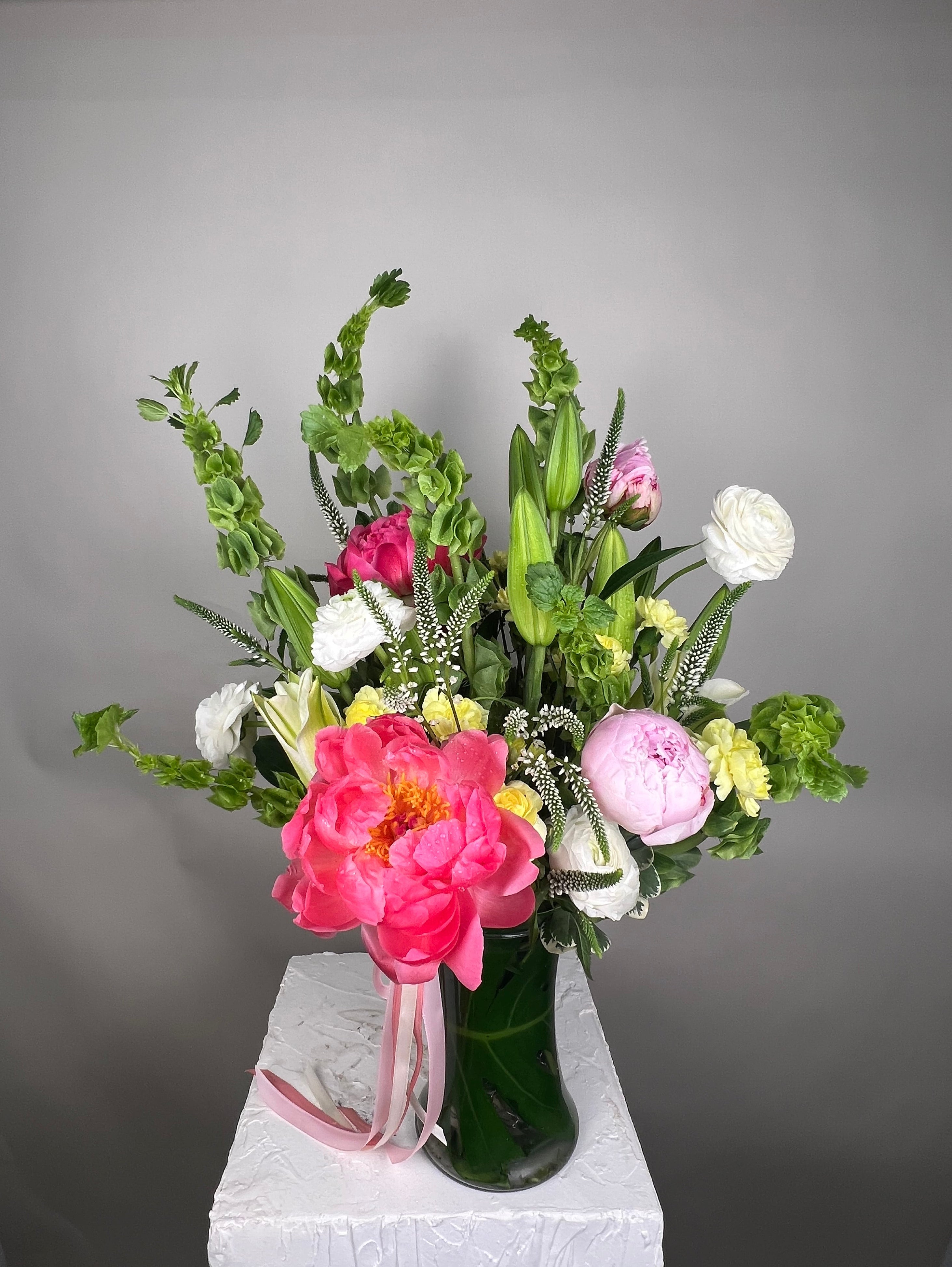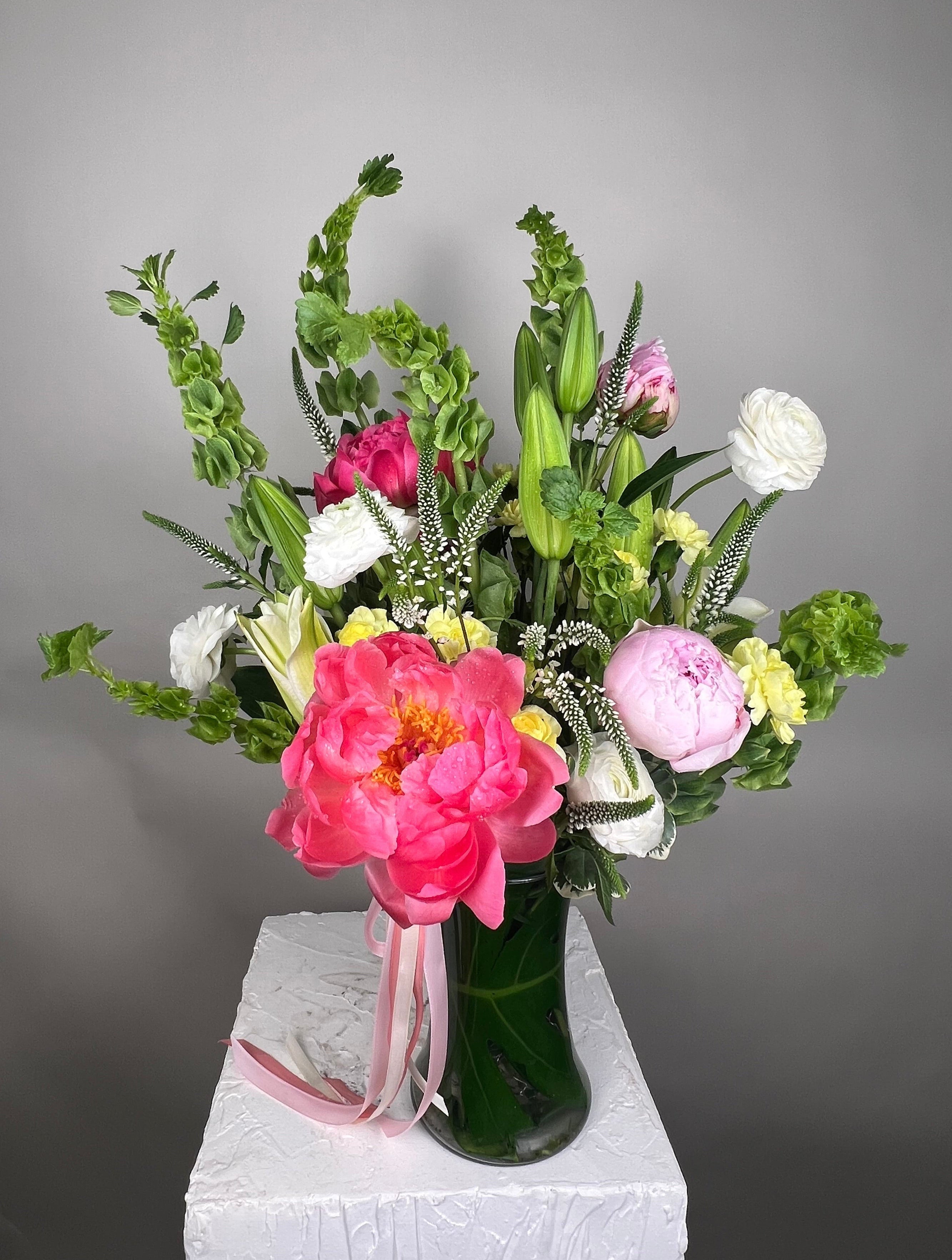 A gorgeous vase of coral and pink peonies, ranunculuses, mini carnations, Irish bells, Veronica flowers, lilies, greenery.