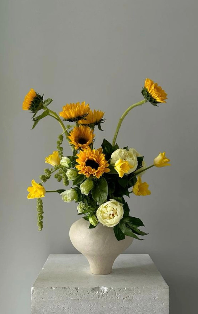 This vase arrangement of yellow sunflowers, green and yellow tulips, cream peonies and amaranth will make your loved one shine like the sun. You can always add paper packaging to your order.